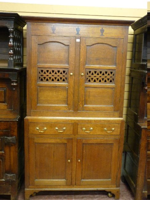 A FINE ANTIQUE WELSH OAK TWO PIECE BREAD AND CHEESE CUPBOARD, the upper section having a top panel of three inlaid urns and having two doors with domed and inset panels over a base of two drawers and two cupboards with brass drop handles on bracket feet, 102 cms wide
