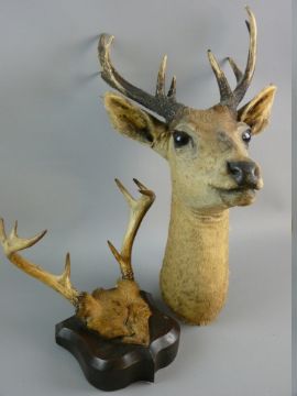 TAXIDERMY, a study of a young deer head with wall mounting bracket to rear along with a pair of antler on a wooden shield shaped wall mount
