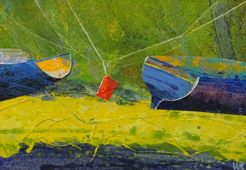 WIL ROWLANDS mixed media - entitled verso 'Red Weight, Cemaes Harbour', signed with initials and signed and dated verso '99, 19 x 30cms
