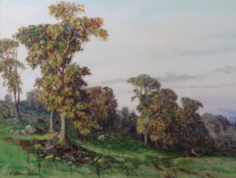J W CLAYTON watercolour - rural treescape with figure and donkey and cart on the path, signed and with title or address label verso, 28 x 43cms