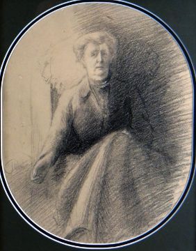 ATTRIBUTED TO AUGUSTUS JOHN mixed media - full portrait of a seated lady, signed, 32 x 25cms Provenance: Letter verso from a previous owner outlining his purchase of the painting from Cobwebs Antiques who had acquired the drawing from the Estate sale of the late Roy Deeley
