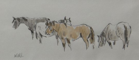 SIR KYFFIN WILLIAMS RA watercolour and pencil - study of four Welsh ponies, entitled verso 'Ponies I', signed with initials, 16 x 34cms