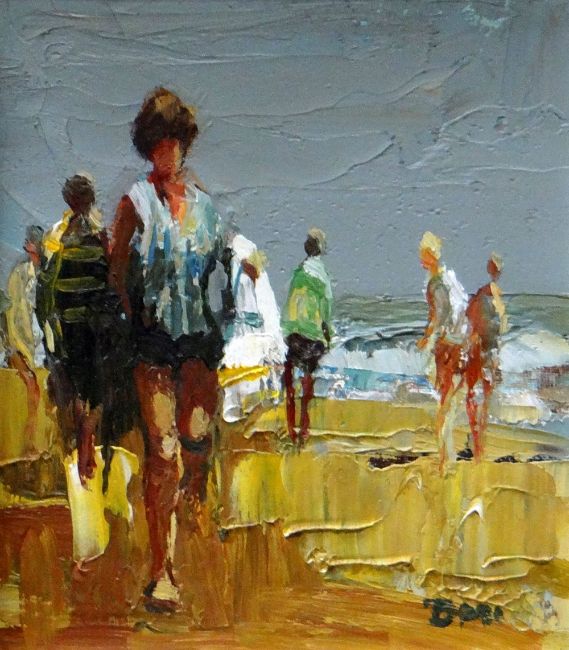DONALD McINTYRE oil on board - figures on a beach entitled verso, 'Bathers', signed with initials, 19 x 17cms Provenance: bequeathed to vendor by late uncle