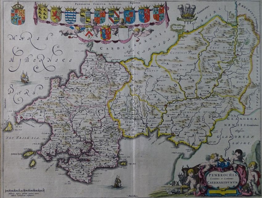 UNKNOWN CARTOGRAPHER a coloured and tinted map of Pembrokeshire and Cardiganshire, attractively coloured coats of arms, mounted but unframed, 43 x 54cms