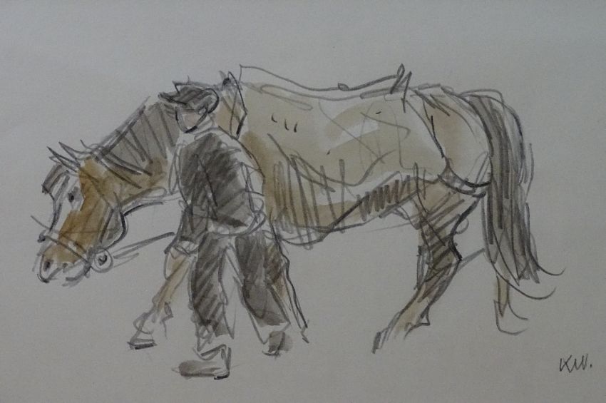 SIR KYFFIN WILLIAMS RA watercolour and pencil - a horse and its handler, signed with initials, 15 x 25cms