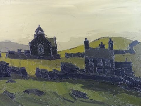 SIR KYFFIN WILLIAMS RA oil on canvas - an early morning sunrise over Llanrhwydrus church near Cemlyn, Anglesey, unsigned but stretcher verso bears title 'Llanrhwydrus' in artist's handwriting, 50 x 60cms Provenance: Purchased by the vendor, a Peer of the Realm, in the 1970s from Tegfryn Gallery, Menai Bridge