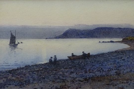 WILLIE STEPHENSON watercolours - a set of three, all depicting Deganwy coastline views with boats and one with figures on the shore, each signed, 10.5 x 18.5 cms and 19 x 11cms