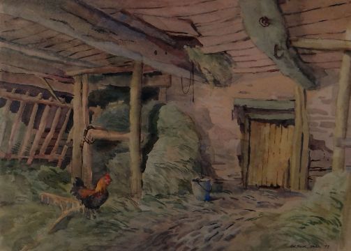 ARTHUR MILES watercolour - interior of barn with cockerel, entitled verso 'Barn near Hay-on-Wye', signed and dated 1977, 26 x 36cms
