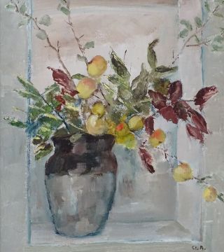 GLADYS ROBERTS oil on board - landscape Abergwyngregyn, signed, 20 x 28cms and oil on board - still life with quince, initialled, 26 x 20cms