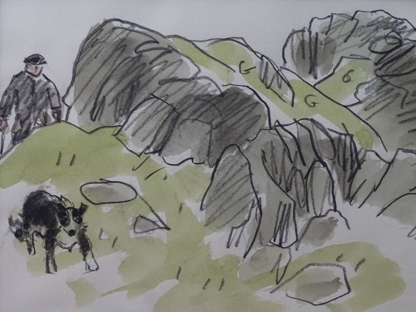 SIR KYFFIN WILLIAMS RA pencil and colourwash - farmer with his dog negotiating a mountain outcrop, signed with initials, 18.5 x 26.5cms
