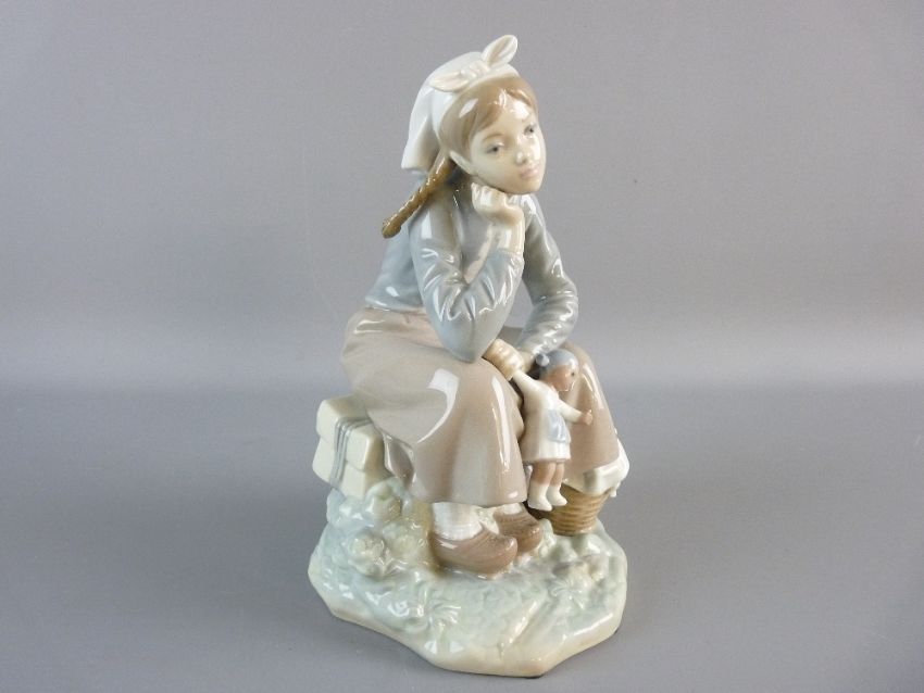 A LLADRO FIGURE of a young seated girl holding a doll with a basket of fruit by her side, no. C-28A to the base, 23 cms high