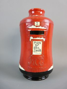 A MOORCROFT POSTBOX VASE, 2008 Collector's Club, 'MCC Moorcroft' to the front, 14 cms high, red, green and black ground with tube line decoration, stamped to the base 'Moorcroft, Made in England', dated 2008, monogrammed 'M R J', (red dot mark)