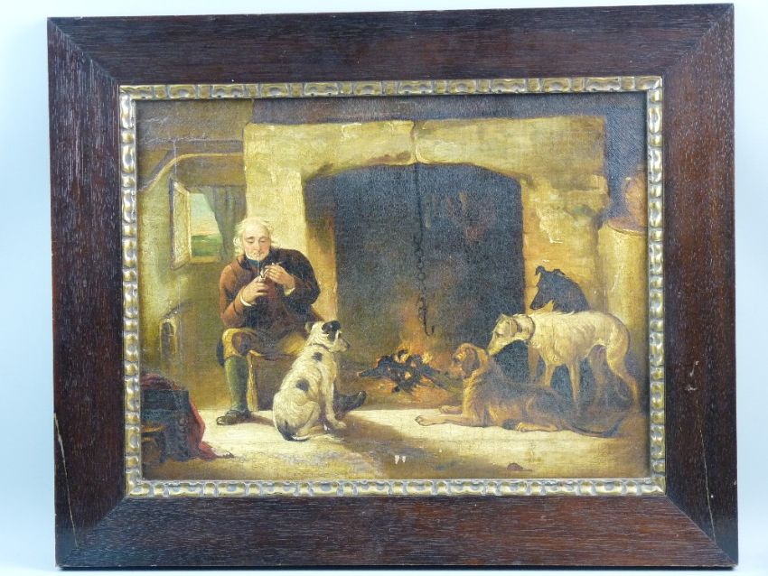 19th CENTURY ENGLISH SCHOOL oil on canvas - seated gentleman lighting up his pipe by a fireplace with his four resting dogs, 33.5 x 44 cms