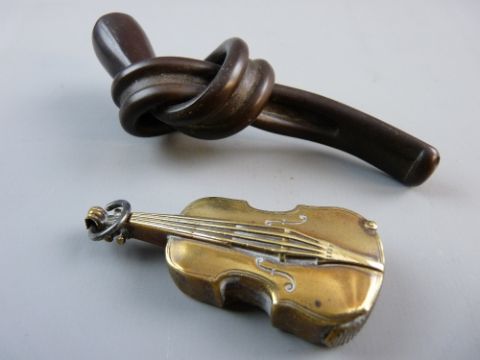 A BRASS VESTA in the form of a violin or cello and a looped and twisted horn cheroot holder