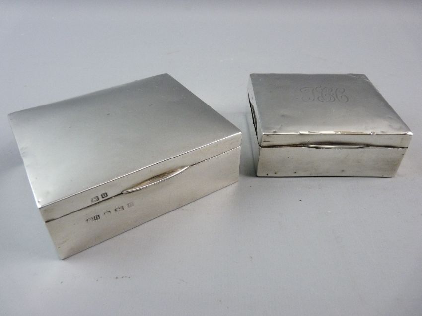 TWO HALLMARKED SILVER CIGARETTE BOXES, 8.5 cms wide, Birmingham 1928 (monogram to top with numerous dents) and a 10 cms wide, Birmingham 1919 (slightly dented)
