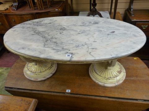AN ITALIAN STYLE MARBLE TOP OVAL COFFEE TABLE with cream and gilt classical urn shaped base, having painted floral decoration and turned cross-stretcher on circular marble supports, 42 cms high, 106 cms wide