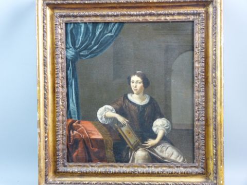 MANNER OF CASPAR NETSCHER oil on canvas - portrait of a seated lady at a table holding an embroidery frame, 34 x 31 cms