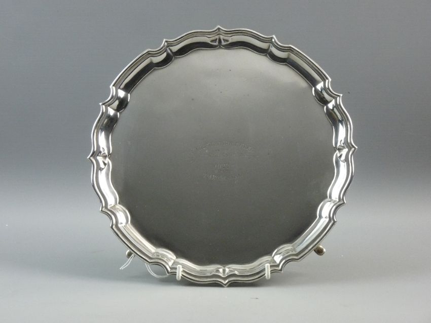 A CHESTER HALLMARKED SILVER CARD TRAY with wavy edge border on four hoof feet, Chester 1918, 18.2 troy ozs approximate weight, with presentation inscription for 1922