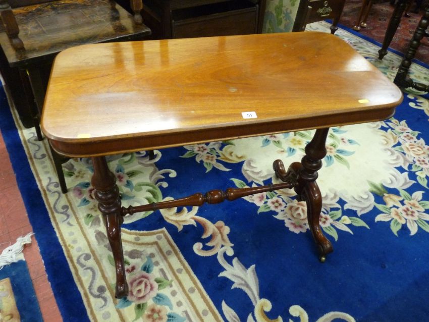 A VICTORIAN MAHOGANY SIDE TABLE, the rectangular top with rounded corners on bulbous turned supports and cross stretcher with carved swept feet on brass castors, 68.5 cms high, 89 cms wide, 45 cms deep
