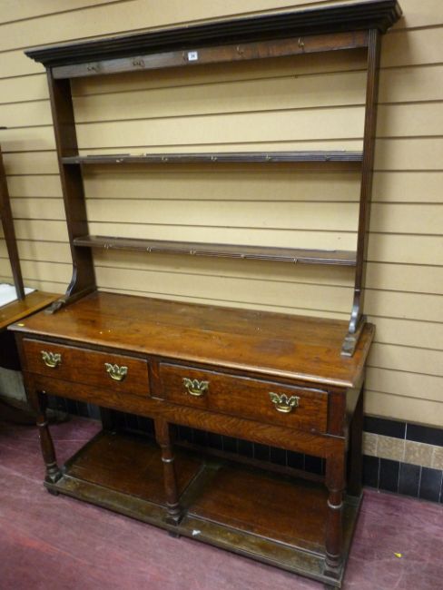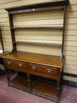 A GEORGE III OAK SOUTH WALES BORDERS DRESSER, neatly proportioned with two shelf open Delft rack on a twin plank moulded edge top, twin pine lined frieze drawers with replacement brass back plates and swing handles, plain frieze with turned and block front supports and open potboard base, 175 cms overall height, 128.5 cms wide, 45.5 cms deep