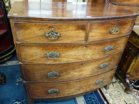 A VICTORIAN MAHOGANY BOW FRONTED CHEST of two short over three long drawers, 103 cms high, 106 cms wide, (replaced handles, requires some restoration)