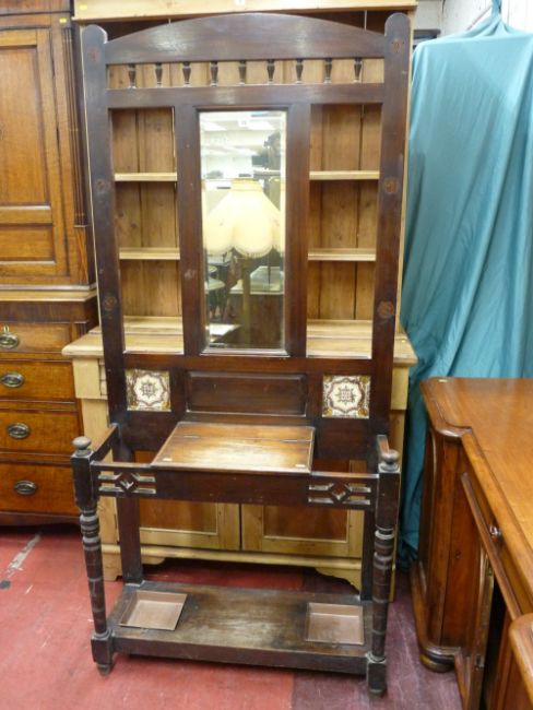 AN EDWARDIAN MAHOGANY MIRRORED HALLSTAND, the galleried top over a central bevelled mirror and twin decorative tiles, lower lidded glove compartment with flanking cane and umbrella apertures complete with drip trays to lower shelf, on block and turned front supports, 198 x 92 cms, (no coat hooks attached but four brass double hooks and a set of ten French style decorative brass hooks with white porcelain ends available)
