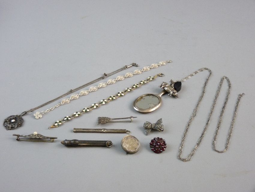 A PARCEL OF MIXED SILVER JEWELLERY including a miniature hand mirror with silver pig charm, 64 grms total