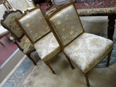 A PAIR OF FRENCH STYLE GILT BEDROOM CHAIRS in a satin floral upholstery and a French walnut armchair with carved top rail and tapestry covered seat and back