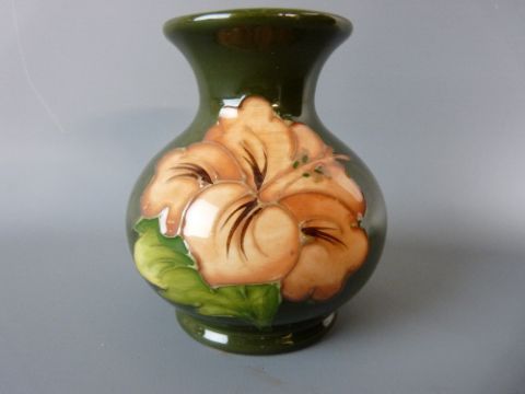 A MOORCROFT HIBISCUS BULBOUS VASE, 10 cms high, decorated on a green ground, impressed 'Moorcroft, Made in England' to the base