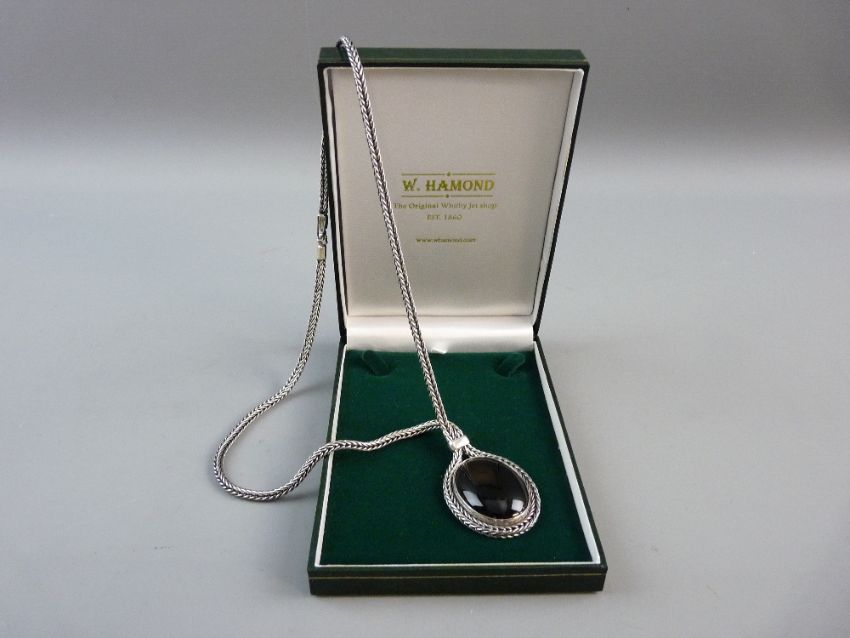 A WHITBY JET PENDANT with 925 silver necklace, 61 grms gross and with cabochon cut jet pendant, 3.7 x 2.8 cms in original W Hamond box complete with outer box and with original Whitby Jet guarantee