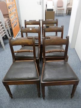 A SET OF SIX REGENCY MAHOGANY DINING CHAIRS, the curved top rail with carved decoration, central rope twist and turned rail with upholstered drop-in seats on turned front supports, (evidence of worm, slight loss to decoration on one or two)