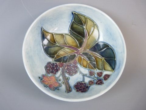 A MOORCROFT BLACKBERRY SHALLOW BOWL, 12 cms diameter, decorated on a blue/grey ground, impressed marks to the base 'Moorcroft, Made in England'
