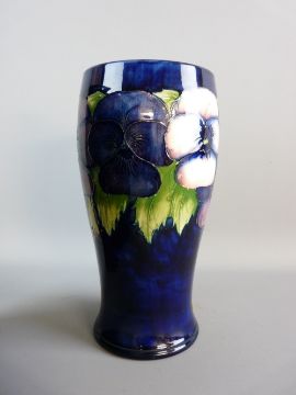 A MOORCROFT PANSY CYLINDRICAL VASE, cobalt blue ground, 24 cms high, 11.5 cms diameter with waisted lower body, marked to the base 'W Moorcroft, Potter to HM The Queen, Made in England', 'W Moorcroft' signature in green, (crazed, very light surface scratches)