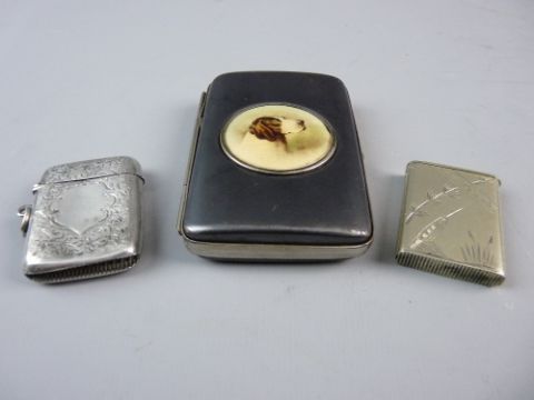 A HALLMARKED SILVER VESTA CASE, Birmingham 1899 with chased decoration and front cartouche, a slim white metal example decorated in the Oriental style of bird amongst bull rushes, maker's stamp 'F.D' and a metal and chrome cigarette case having a print decorated roundel of a spaniel's head with indistinct signature