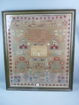 A LARGE VICTORIAN FRAMED NEEDLEWORK SAMPLER titled 'Mary Thomas, Her Work, 1894' alphabet and numerical rows and the verse 'For I Know That My Redeemer Liveth' along with birds, animals, trees and flora, a central building with crows to the roof, titled 'Henllan Cottage', 87 x 75 cms within frame (browned with some staining and some small holes)