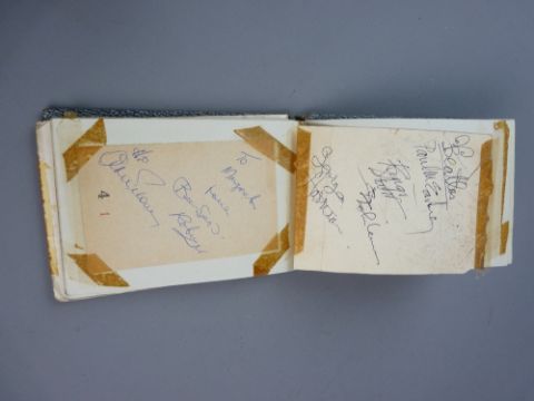 AUTOGRAPHS/THE BEATLES - a vintage pocket album, mid to late 1960s containing signatures and let-ins including one titled 'Beatles' with four signatures - Paul McCartney, Ringo Starr, John Lennon, George Harrison - other notables include Tom Jones, The Bee Gees as well as lesser know bands and entertainers (Please Note: we have no provenance or further information as to how, where or when this album was compiled, we strongly advise as with any other Lot in auction that potential bidders satisfy themselves as to the authenticity and/or condition of any Lot. Imagery, written or verbal information is provided as a guide and does not in any part form a guarantee, purchase will be made entirely at the bidder's own risk)