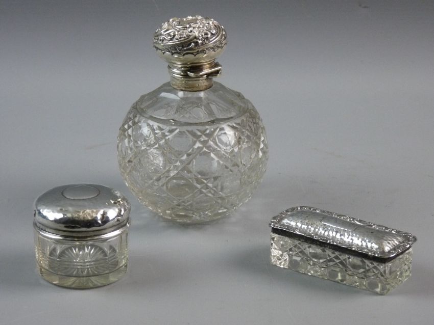 THREE DRESSING TABLE ITEMS with hallmarked silver tops to include an oblong lidded box, Birmingham 1905, a circular lidded pot, Birmingham (date stamp rubbed) and a hobnail cut globular scent bottle, Birmingham 1902 having a hinged lidded top with interior stopper present (hinge requires attention)
