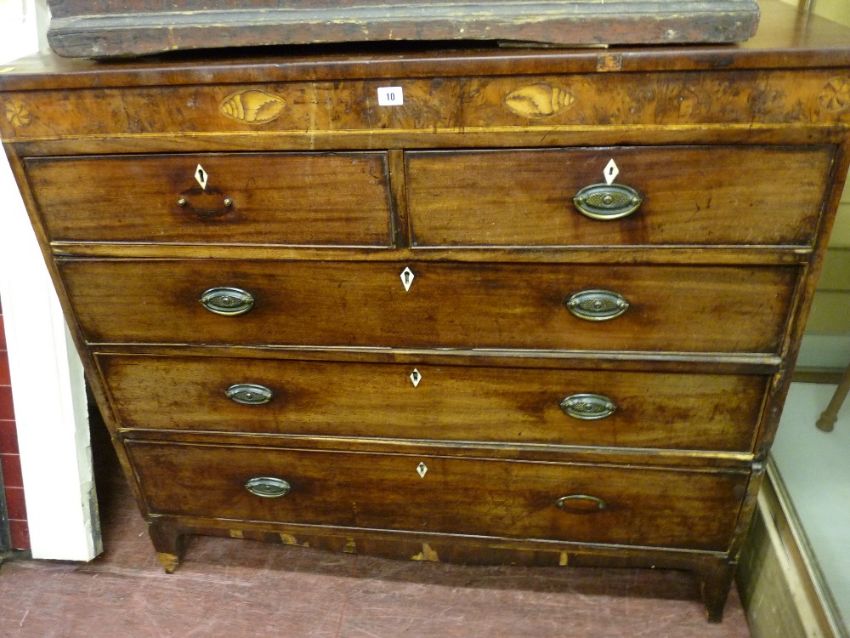 A GEORGE IV MAHOGANY CHEST of two short over three long drawers with Sheraton style inlay, oval brass backplates and pommels with swing handles and ivory escutcheons, on corner bracket feet, (for restoration)
