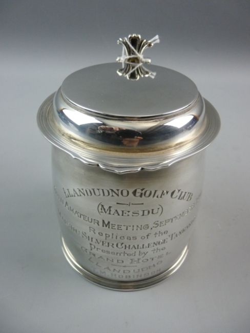 A HALLMARKED SILVER PRESENTATION LIDDED TANKARD having a scroll shaped handle with raised thumbpiece, presentation inscription reads 'Llandudno Golf Club (Maesdu) Open Amateur Meeting, September 1924, Replicas of the Maesdu Silver Challenge Tankards, Presented by The Grand Hotel, Llandudno' (with the recipient's name), London 1924, 14 troy ozs approximate weight, 13 cms overall height