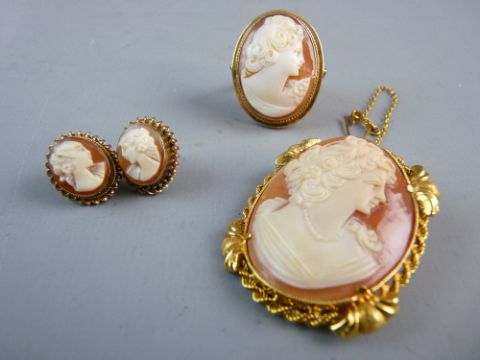 A YELLOW METAL TWIST FRAMED OVAL LADY CAMEO BROOCH, a nine carat gold dress ring with oval lady cameo and a pair of possibly gold oval cameo earrings with butterfly fastenings