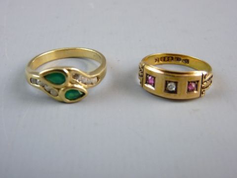 A FOURTEEN CARAT GOLD CROSSOVER DRESS RING with two tear drop emeralds and tiny flanking diamonds, 49 grms total and a fifteen carat gold Victorian ring with centre tiny diamond and flanking rubies, 2.5 grms