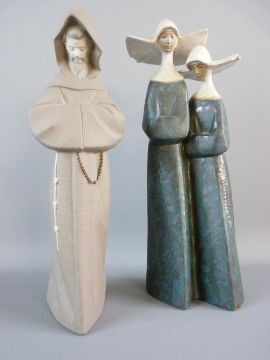 A LLADRO FIGURAL GROUP of two nuns, finished in satin glazes and a matt glazed figure of a hooded monk, nos. E-3N and F-16O respectively, 34 cms high