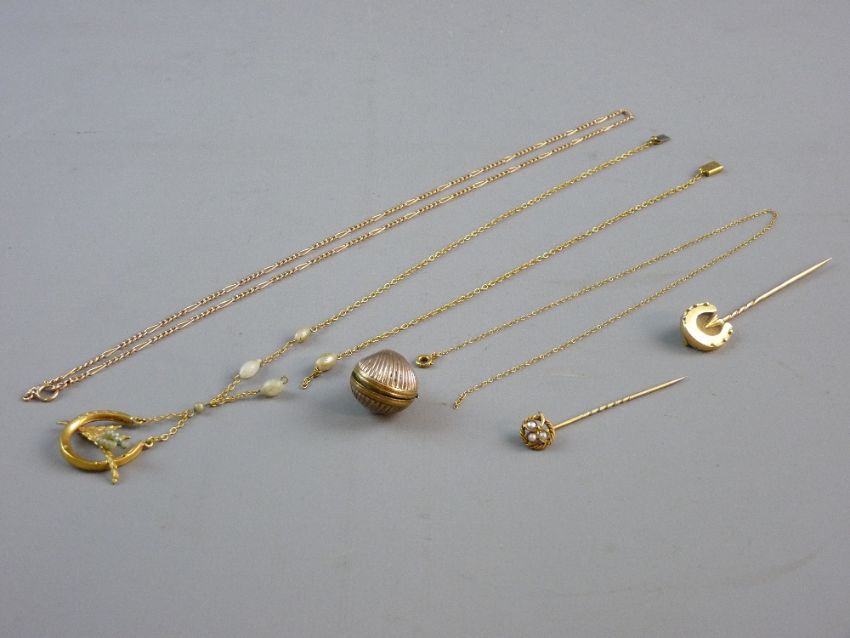 A SMALL PARCEL OF MAINLY GOLD ITEMS including two stickpins, one horseshoe and one seed pearl decorated, 18 grms total