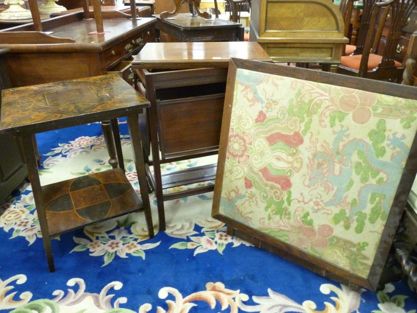 AN EDWARDIAN MAHOGANY CARD TABLE with foldover swivel top and four lift-out side trays on reeded square supports with cross stretchers and under tier shelf, a vintage fold-up table with Oriental patterned cover top and a decorative two tier side table, the top decorated with mythical beasts, various measurements