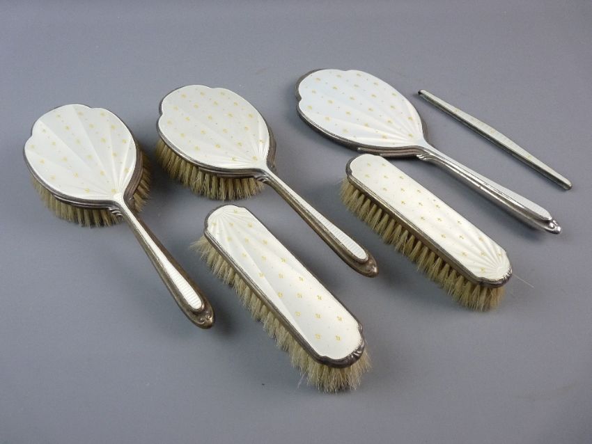 A HALLMARKED SILVER AND GUILLOCHE ENAMEL MIRROR AND BRUSH SET, comprising hand mirror, four brushes and a comb holder, pearl enamel with gilt decoration, Birmingham 1963, comb holder 1964