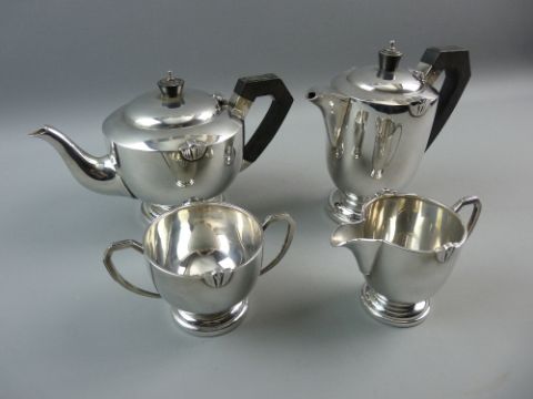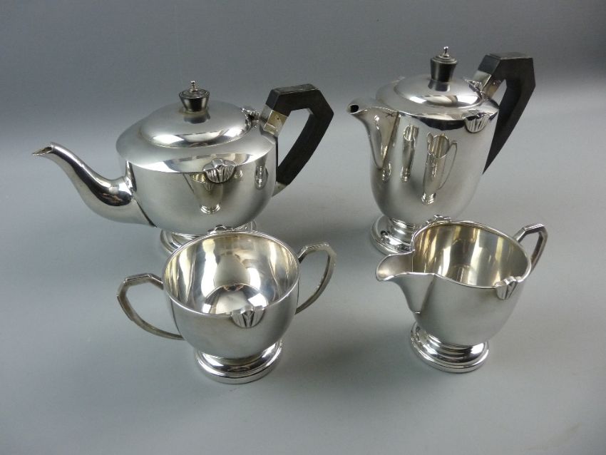 A FOUR PIECE HALLMARKED SILVER TEASET comprising tea and coffee pot with bakelite style handles and finials, cream jug and twin handled sugar basin, all applied with Art Deco style motifs, all with circular bases, dates for Birmingham 1945 and 1946, 46 troy ozs approximate overall weight, (dent to side of coffee pot, one small dent to teapot)