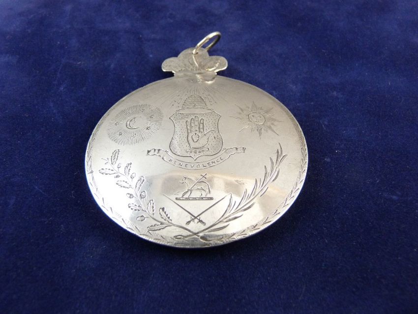 A CIRCULAR WHITE METAL MASONIC MEDALLION, domed back and front with triple feather holder to the top, one side bearing various Masonic symbols and with a presentation inscription to the other side 'By the Officers and Brothers of St Peter's Lodge, Chirk, No. 502, 1834', diameter 6.5 cms