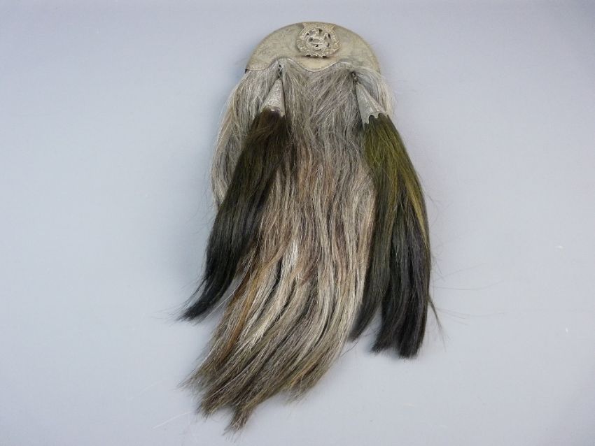 A 10th SCOTTISH BATALLION 'THE KINGS LIVERPOOL REGIMENT SPORRAN', early 20th Century with thistle and chase decorated cantle and regimental badge, complete with tassels and purse, 16 cms wide