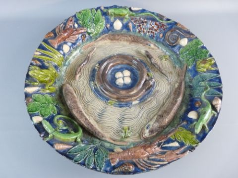 A LARGE BERNARD PALISSY STYLE DEEP DISH CHARGER, 49 cms diameter with profuse fish, reptile and crustacean decoration, having a central coiled snake around a group of four shells, the whole in semi-Majolica glazed colours, the reverse side decorated with a mottled brown, ochre and blue finish, (staple repairs, chips, cracks and losses), no visible maker's marks, probably French