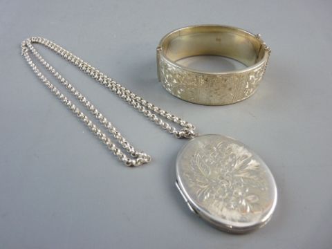 A LADY'S ENGRAVED WIDE SILVER BRACELET, half bright cut with floral decoration, 1 oz and a large oval bright cut silver photo locket with link chain, 1.2 ozs